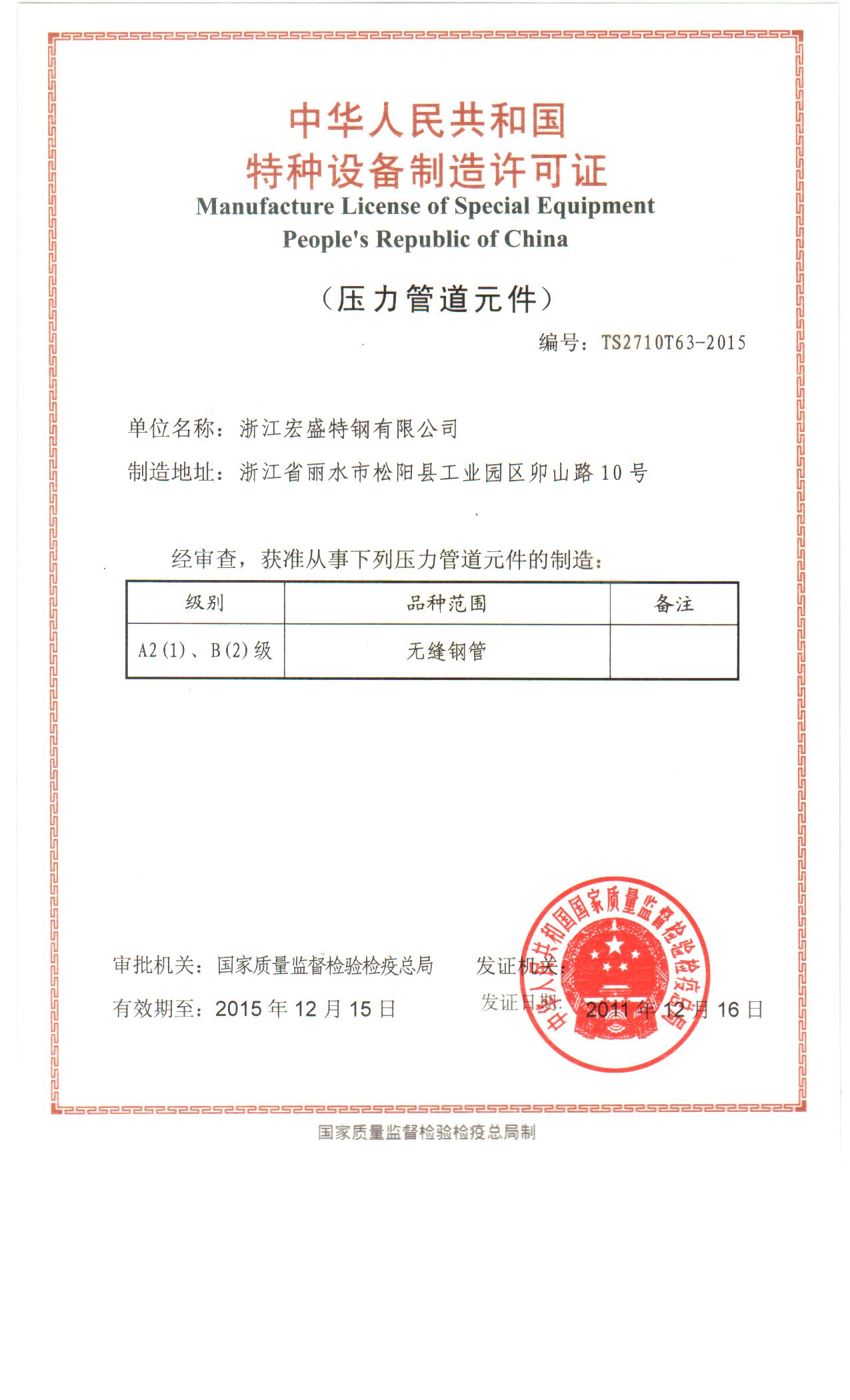 國家A2(1)、B(2)特種設(shè)備制造許可證(壓力管道元件),證書編號:TS2710T63-2015
